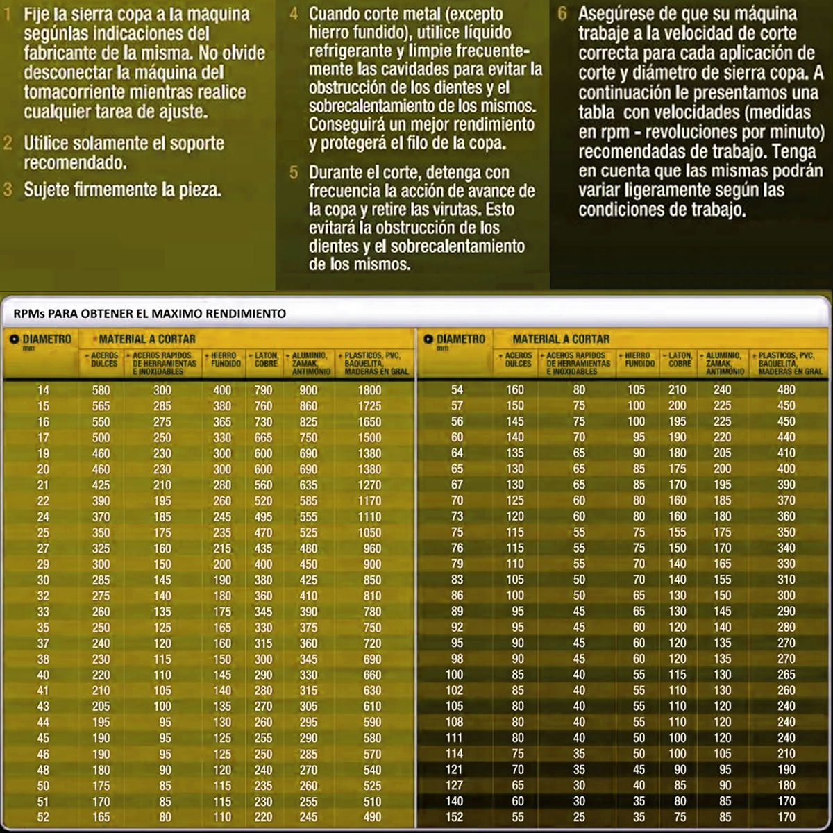 Respetar las velocidades recomendadas para el corte de acuerdo con el diámetro y tipo de material a cortar